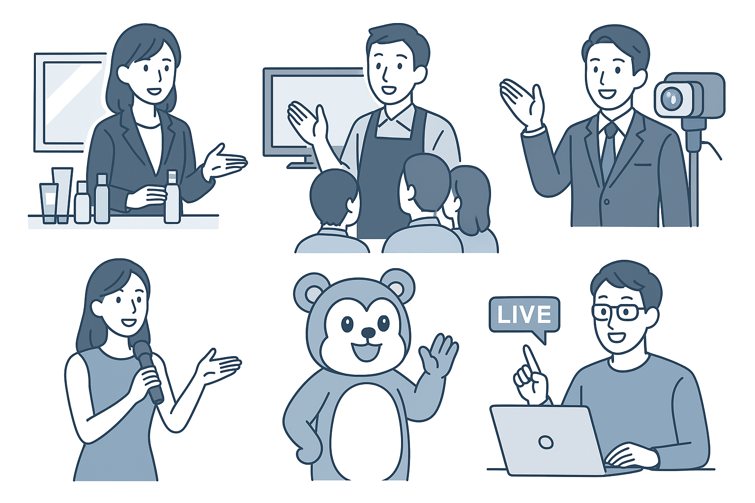 実演販売士・商品アドバイザー・通販ゲスト・美容研究家などの役割を担い、マスメディア(TV/ラジオ/雑誌/インターネットetc)に出演して商品の紹介・訴求を行います。